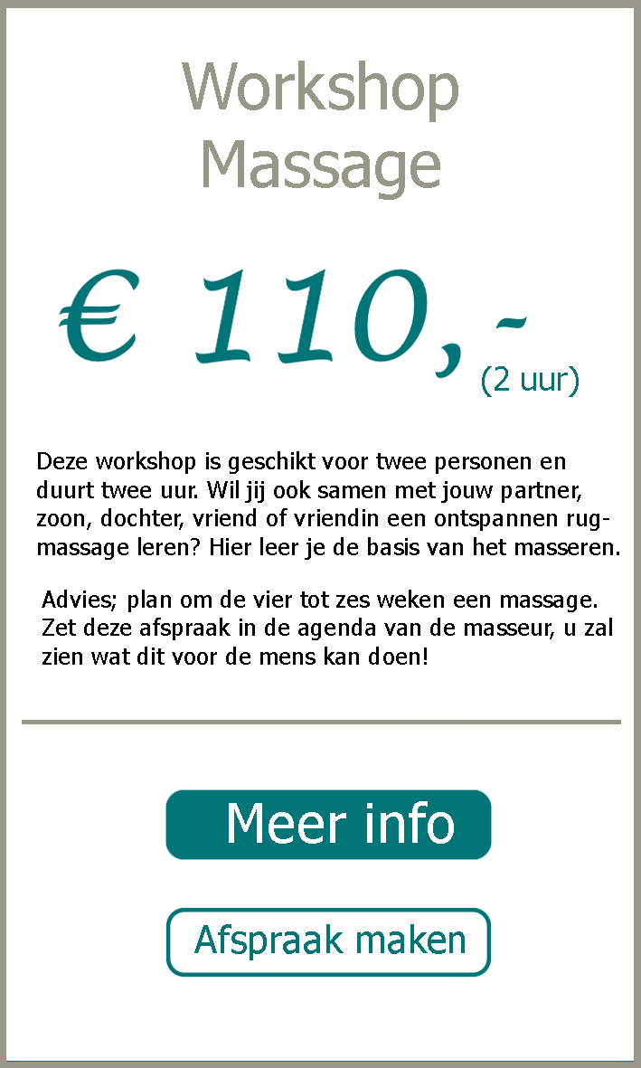 Als u twijfelt welke massage de juiste voor u is dan kunt u terecht voor een klant specifieke massage voor 50 euro. Aan de hand van deze eerste massage kan ik vaststellen wat voor u de juiste behandeling is.